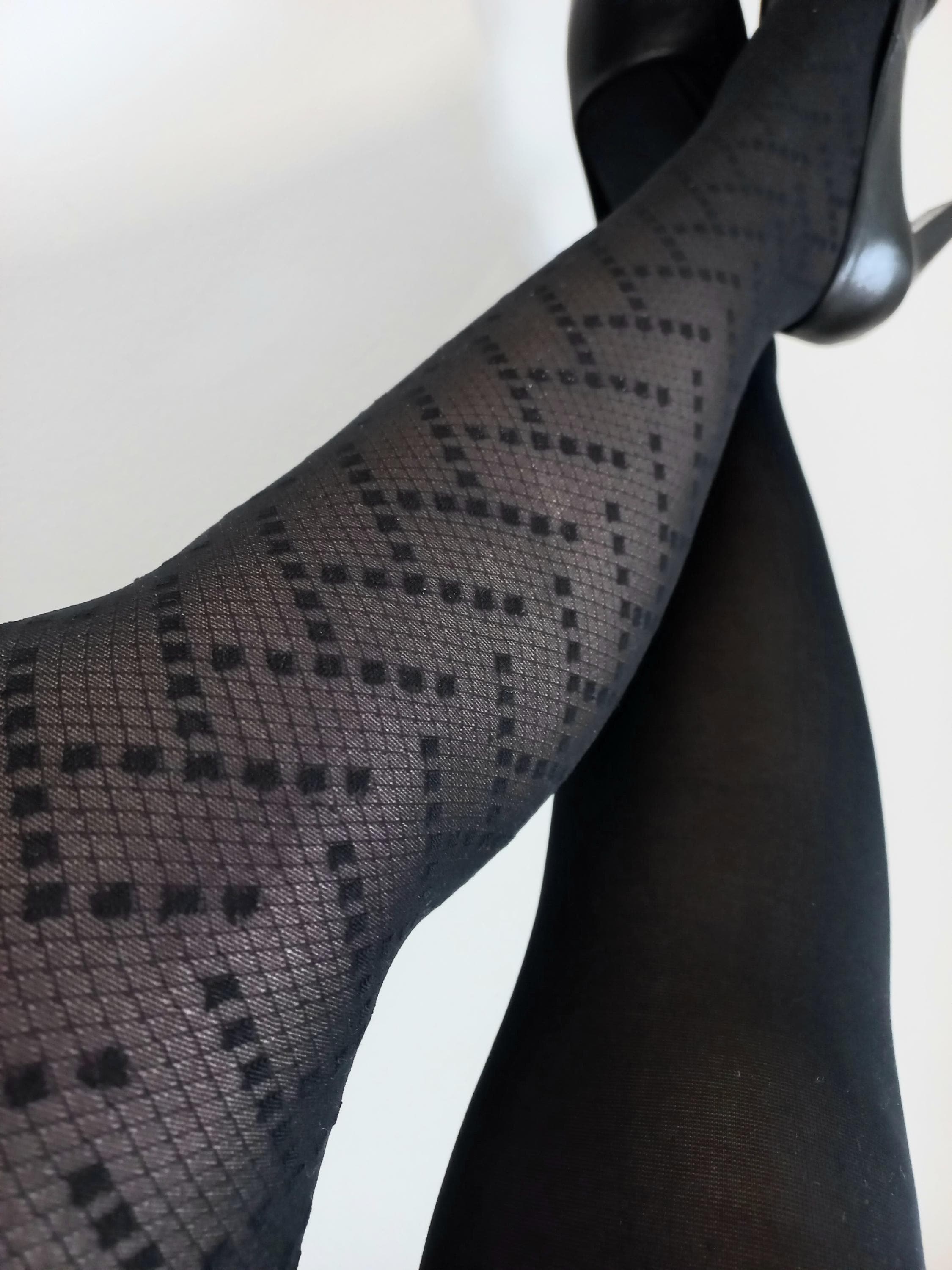 Fancy tights, women's tights, women's tights, fancy tights, tights, two-tone tights, women's tights, colored tights, unique tights, fashion tights, unique tights, original tights, black tights, two-tone black tights, black tights with geometric patterns, tights made in France, handmade tights, handmade, hand-sewn, unique tights design